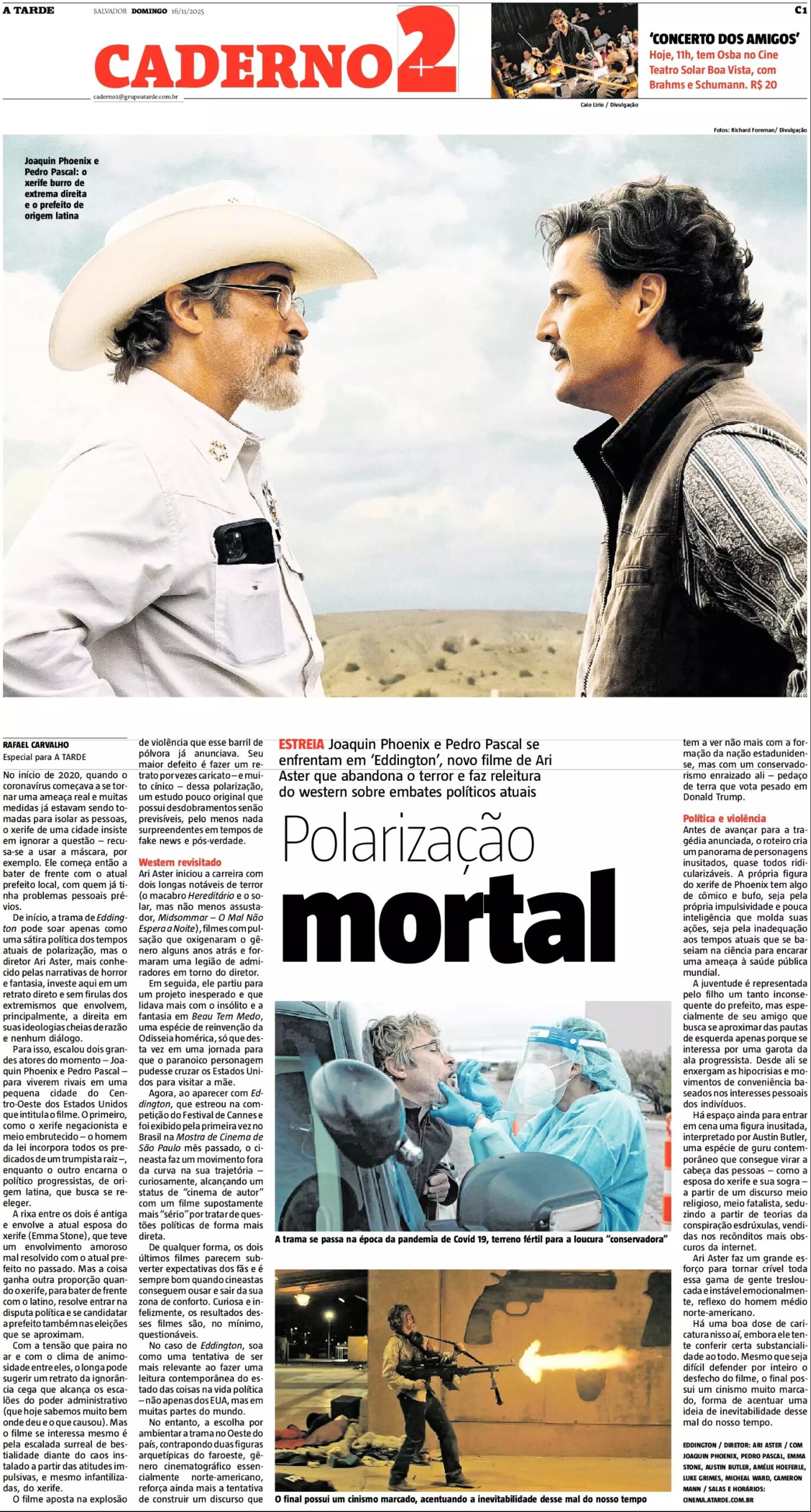 Para isso, escalou dois grandes atores do momento – Joaquin Phoenix e Pedro Pascal – para viverem rivais em uma pequena cidade do Centro-Oeste dos Estados Unidos que intitula o filme. O primeiro, como o xerife negacionista e meio embrutecido – o homem da lei incorpora todos os predicados de um trumpista raiz –, enquanto o outro encarna o político progressistas, de origem latina, que busca se reeleger.